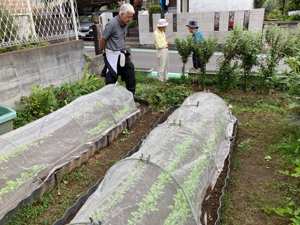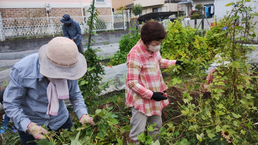 そんな中でも10名の常連さんたちがお見え下さり、絡まった朝顔のツルを外すなど、夏の名残りを整理して下さいました。